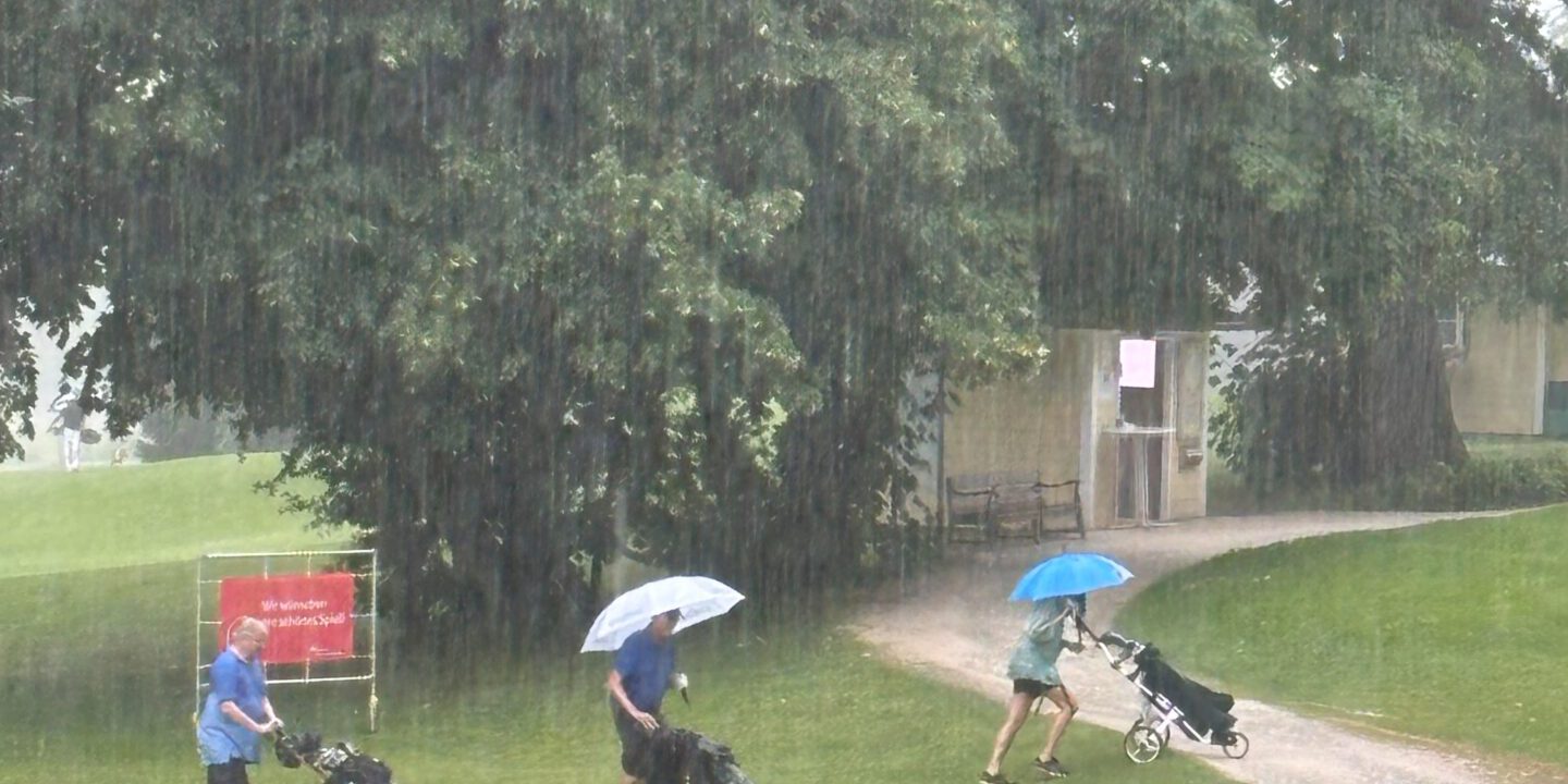 Doch nach rund zweieinhalb Stunden Spielzeit machten Blitz und Donnergrollen den Golfern einen Strich durch die Rechnung. Das Turnier musste unterbrochen werden und die Teilnehmer suchten auf der Terrasse des Restaurants Alpenblick Schutz, wo sie geduldig abwarteten, bis das Gewitter weiter in Richtung Alpen zog.